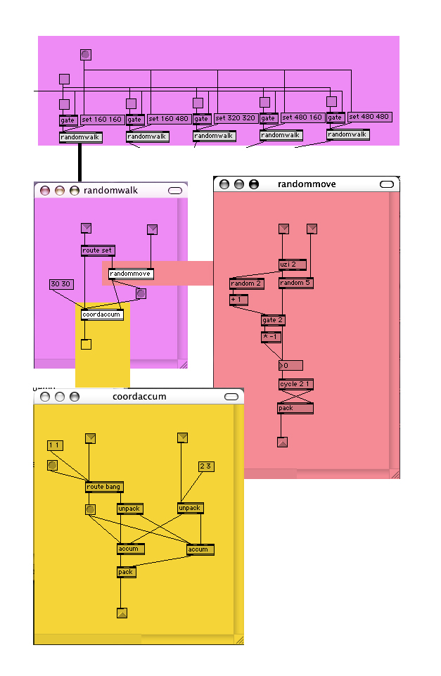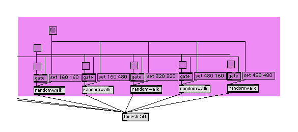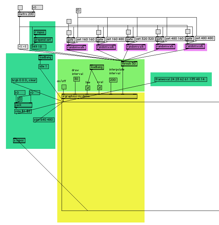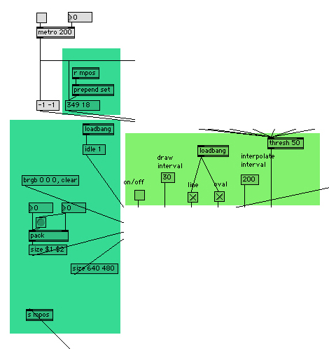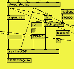 Click on each area for an enlargement. Area A starts off the process with a bang, literally and figuratively. A bang is sent every .2 seconds to the positional input fields (top green area). At the same time, a bang is sent to begin tracking mouse position in demo mode (left green area). Area B initially set up with an arbitrary first set of coordinates, this array (which represent five dark-valued pixels of the translated walking grid) are updated every .2 seconds. The information is fed to Area D. (Click on purple rectangles in main schematic for detailed view.) Area C mouse position is sent to Area D (demo mode only). Also, a dummy set of values is sent to Area D to reconcile discrepancies between scanning programming and drawing programming. As the mouse moves, the C1 area sends new mouse position back up to Area C, and its coordinates are fed into the program. Area D the coordinate sets are unpacked and sent to their respective input fields: point 1 on one side, point 2 on the other side. D1 is a holding bin for line information. D2 is a holding bin for special messages information (in this case, an expanding circle). D3 is a holding bin for circle information. D4 sends the signal to draw all the elements. D5 sends a clear screen signal every 50 ms. Without this feature, all lines, messages and circles that are drawn (every .2 seconds) would remain on the image and would result in a cumulative mass of information. Area E this area of programming controls LCD screen variables (size and background color).